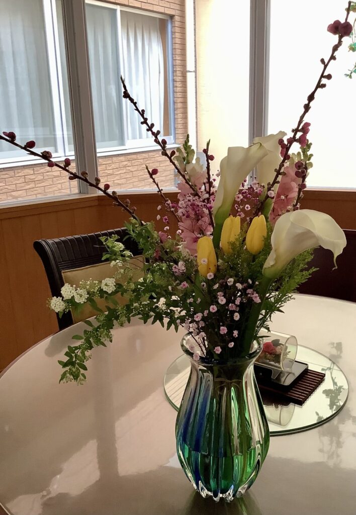 今月のお花が届きました。春らしくとても色とりどりできれいですね。