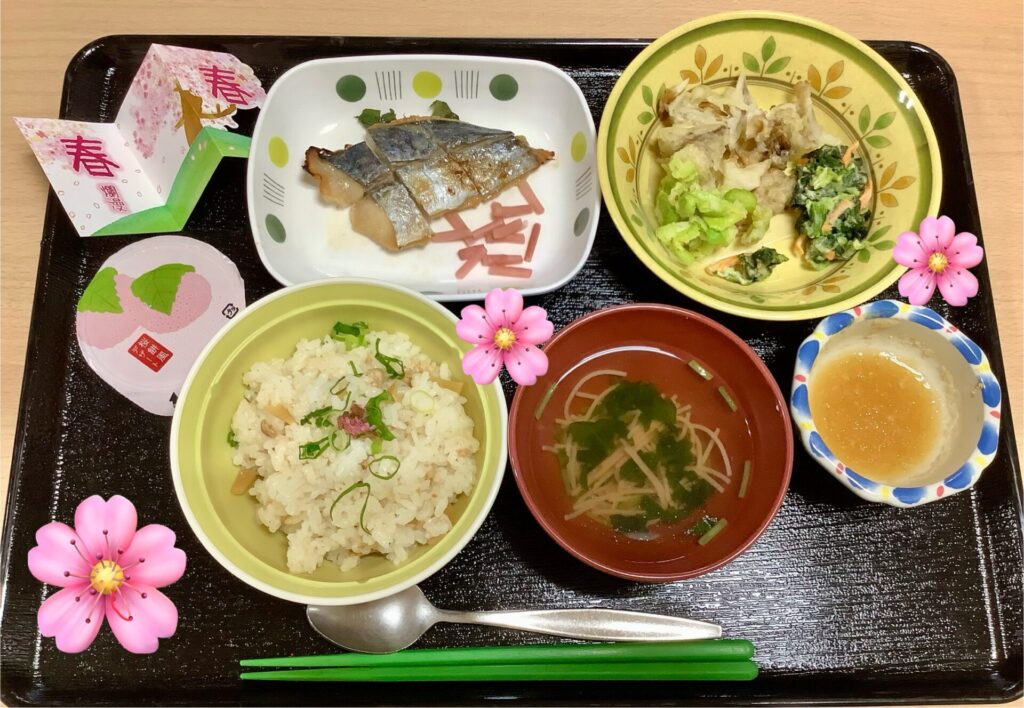 とても春らしい献立で、月1回の行事食を喜んで利用者様に召し上がって頂けました。